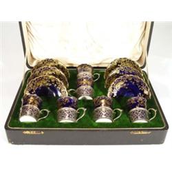 Cased set of six Aynsley bone china and silver mounted coffee cans and saucers, gilded with flowers onto a cobalt blue ground,
