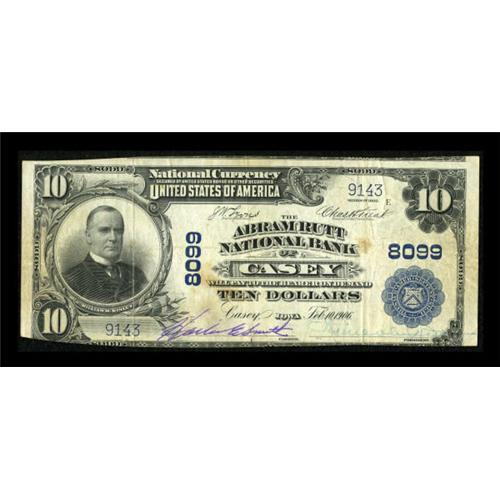 <B>Casey, IA</B></I> - $10 1902 Plain Back Fr. 625 <B>The Abram Rutt NB</B></I> Ch. # 8099<BR> A great private name bank with as good a private name title as could exist. <B>Fine-Very Fine,</B></I> with the bottom margin trimmed quite a bit into the design.<BR><BR><b>Shipping:</b> Coins & Currency (<a target="_blank" href="http://www.heritageauctions.com/common/shipping.php">view shipping information</a>)