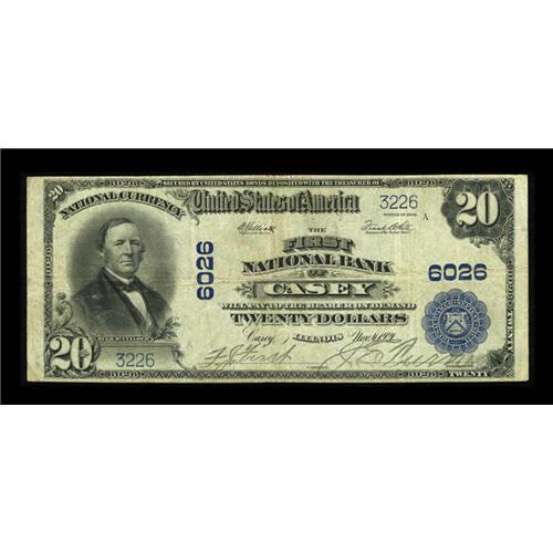 <B>Casey, IL</B></I> - $20 1902 Plain Back Fr. 660 <B>The First NB</B></I> Ch. # 6026<BR>This <B>Fine-Very Fine</B></I> piece from one of three issuers in this Clark County community sports dark signatures. Strong margins add to the overall appearance of this lightly worn piece of which Kelly reports eight large size.<BR><I>From The Lincoln Collection</B></I><BR><BR><b>Shipping:</b> Coins & Currency (<a target="_blank" href="http://www.heritageauctions.com/common/shipping.php">view shipping information</a>)