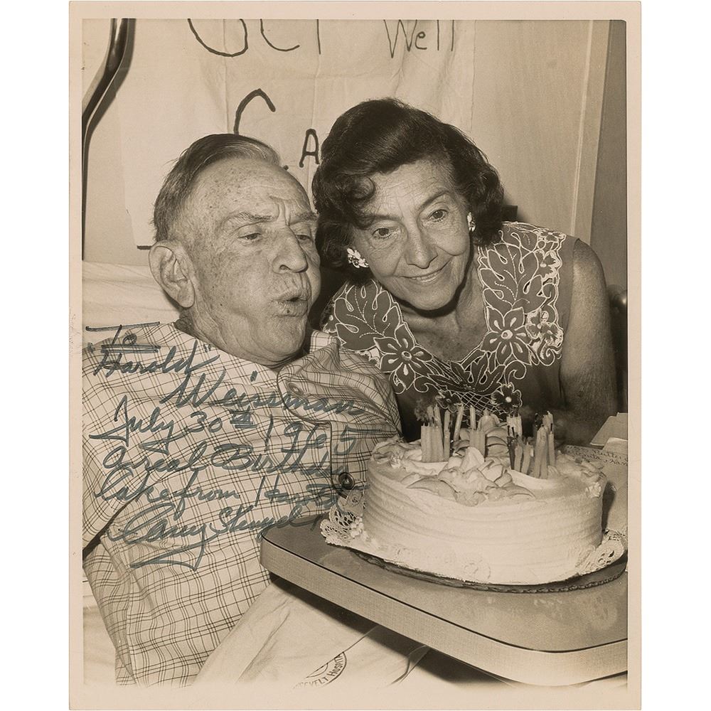 Glossy 8 x 10 photo of Stengel blowing out his birthday candles from a hospital bed, his wife Edna looking on, signed and inscribed in black felt tip, "To 'Harold' Weissman, July 30th 1965, a real Birthday Cake from Harold, Casey Stengel.” In very good to fine condition, with some scattered creasing.