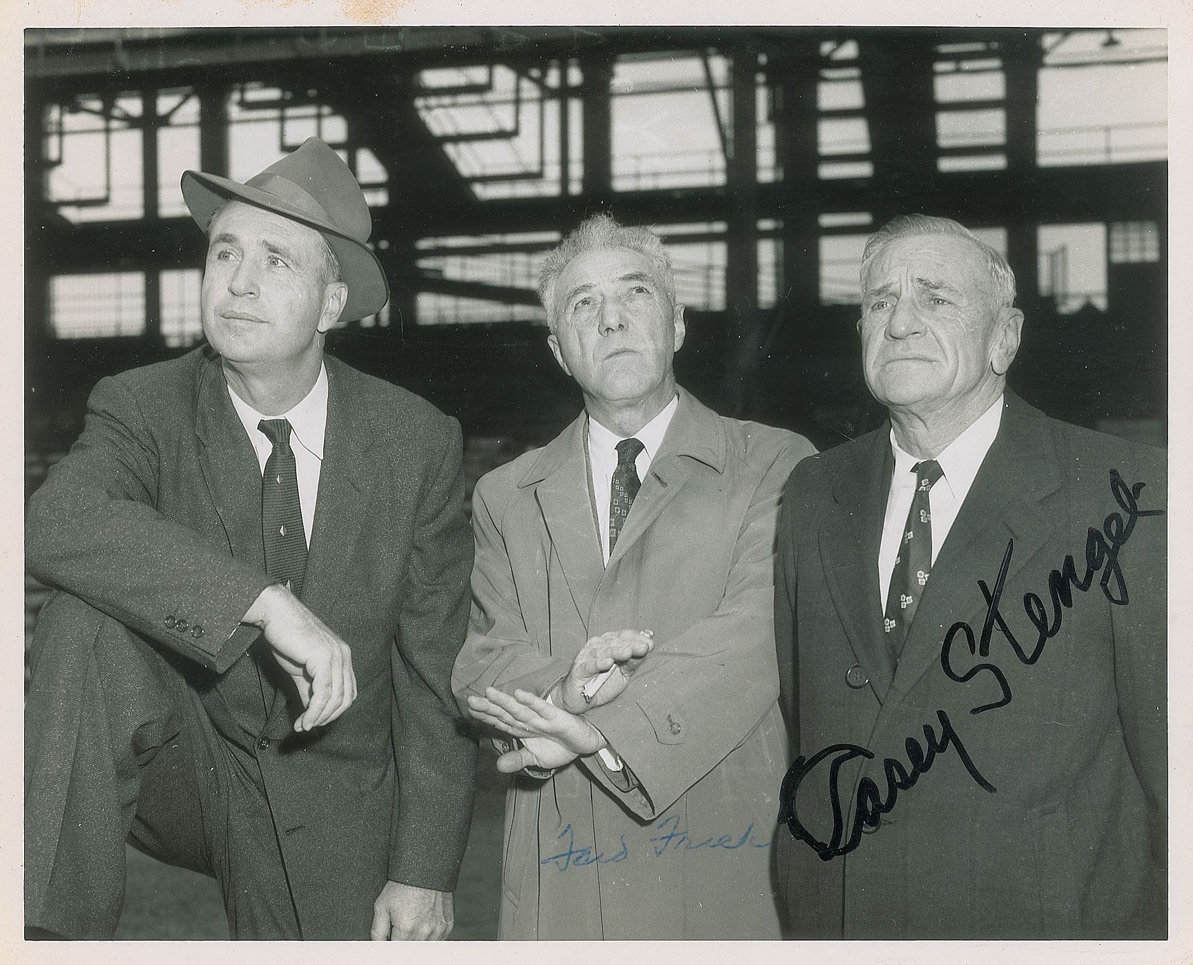 Glossy 10 x 8 photo of baseball commissioner Ford Frick posing alongside Hall of Fame managers Casey Stengel and Walter Alston, signed in black felt tip by Stengel and in blue ballpoint by Frick. Reverse bears a United Press International stamp. In fine condition.