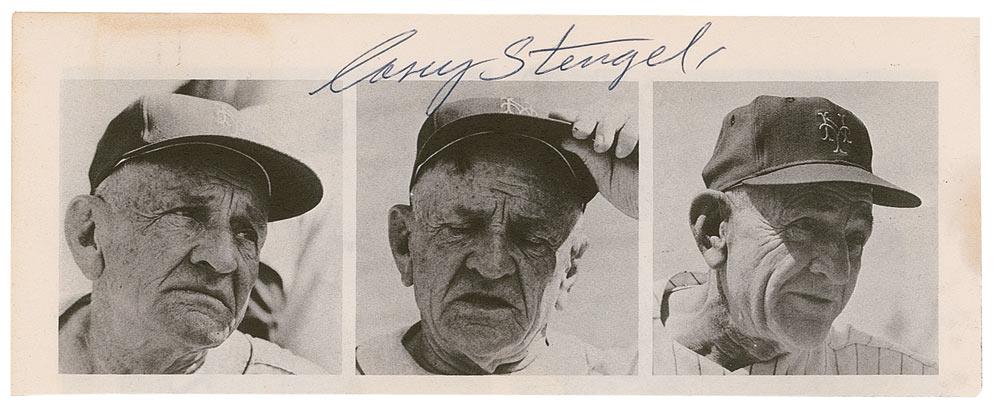 Vintage 8.5 x 3.25 book photo clipped from a publication, signed in blue ballpoint “Casey Stengel.” Light wrinkling, a few areas of edge toning, and a rusty paperclip impression at the left top edge, otherwise fine condition.