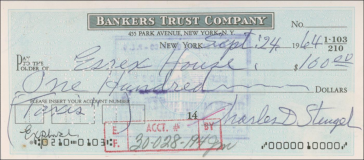 Bank check, 6.25 x 2.75, filled out and signed by Stengel, “Charles D. Stengel,” payable to Essex House for September 24, 1964. Endorsed in the same manner by Stengel on the reverse. Expected bank stamps and cancellation holes affecting portions of both signatures, and a few spots of soiling at the lower left corner, otherwise fine condition.
