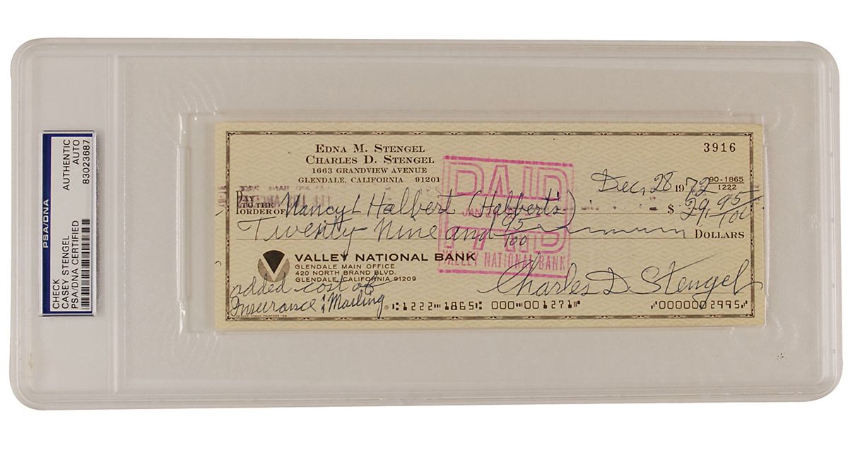 Personal check, 8 x 3, filled out and signed by Stengel, “Charles D. Stengel,” payable to Nancy L. Halbert for $29.95, December 28, 1972. Encapsulated in a plastic PSA/DNA authentication holder. A central vertical fold, some creasing to the lower right, and expected bank stamps (one slightly affecting the signature), otherwise fine condition. An uncommon example of Stengel’s full signature.