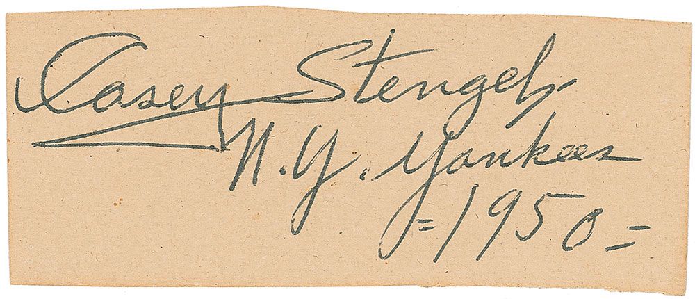 Vintage ballpoint signature, “Casey Stengel, N. Y. Yankees, 1950,” on an off-white 4.25 x 1.75 card. In fine condition, with slightly irregularly trimmed edges. Accompanied by an unsigned vintage glossy press photo.