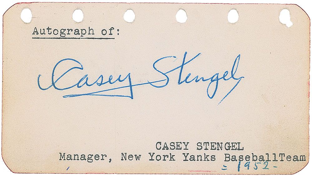 Vintage ballpoint signature, “Casey Stengel,” on an off-white 4.5 x 2.5 page, dated “1952” at the bottom in an unknown hand. In fine condition, with some slight edge toning.