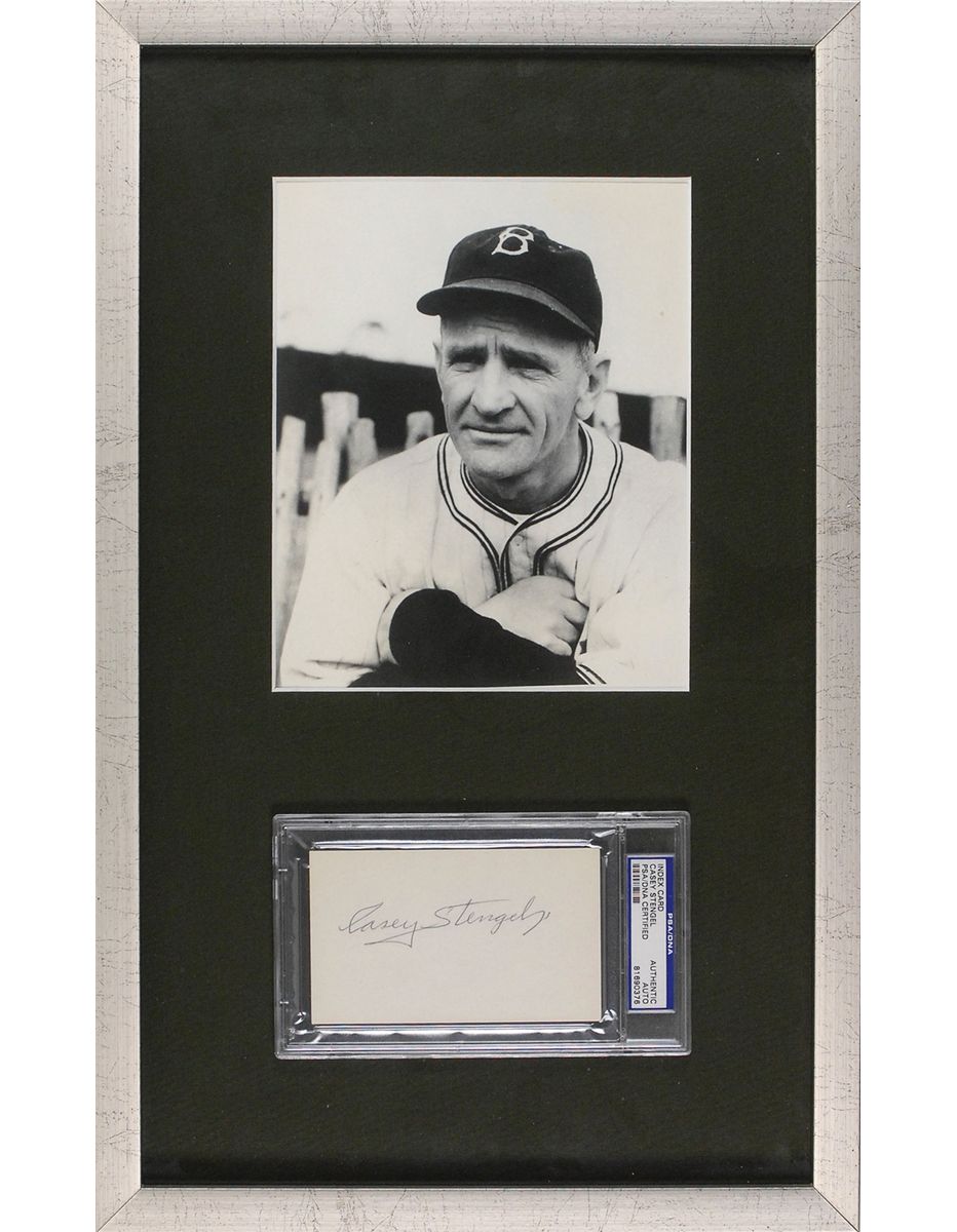 Ballpoint signature, “Casey Stengel,” on an off-white 5 x 3 card. Encapsulated in a plastic PSA/DNA authentication holder. Framed with a portrait of Stengel in his Brooklyn uniform to an overall size of 13.25 x 21. In very fine condition.