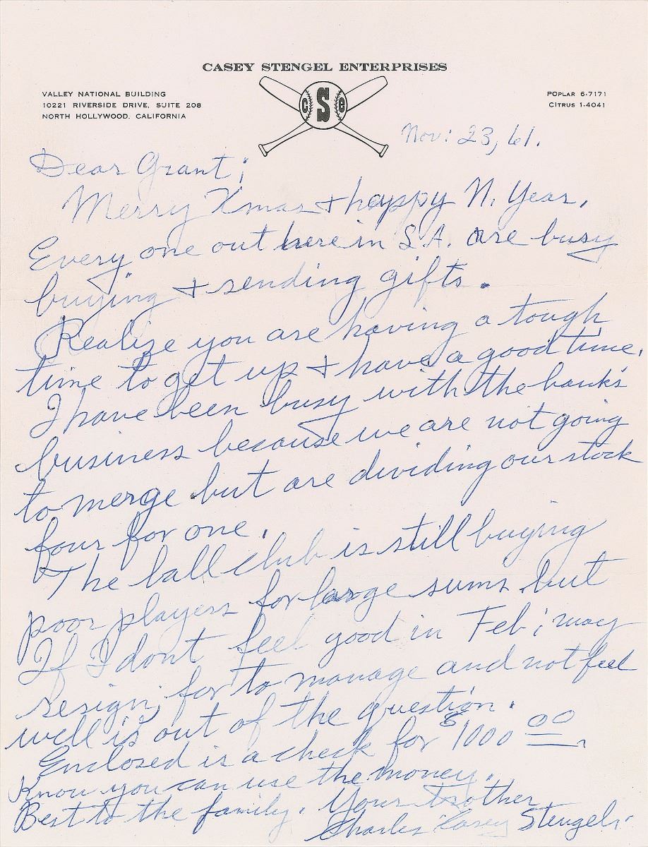 ALS signed “Charles Casey Stengel,” one page, 8.5 x 11, personal letterhead, November 23, 1961. Letter to his brother Grant Stengel, in full: “Merry Xmas + happy N. Year. Every one out here in S. A. are busy buying + sending gifts. Realize you are having a tough time to get up + have a good time. I have been busy with the bank’s business because we are not going to merge but are dividing our stock four for one. The ball club is still buying poor players for large sums but if I don’t feel good in Feb I may resign; for to manage and not feel well is out of the question. Enclosed is a check for $1000.00. Know you can use the money. Best to the family.” In fine condition. Accompanied by an unsigned photograph, and the original mailing envelope, addressed in Stengel’s own hand. Also accompanied by a letter of provenance from a relative of Stengel.