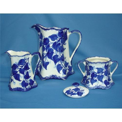 Here is a set of three in cobalt "Bittersweet" pattern from the Cash Family (marked on bottoms). The set includes a large Buttermilk pitcher, 8.5", small pitcher, 5.5", and sugar with lid, 5".