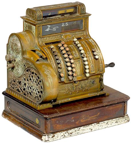 Registrierkasse "National Mod. 422", 1913 Serien-Nr. 1268459, 5-reihige Tastenkasse mit 42 Tasten, mit Handkurbel und Belegzettel-Drucker, reich verziertes Bronzegehäuse mit Schubfach, Maße: 52 x 42 x 59 cm, Beschriftung der Tasten nicht komplett, für englische Währung. Nach Reinigung ein imposantes Sammlungsstück!