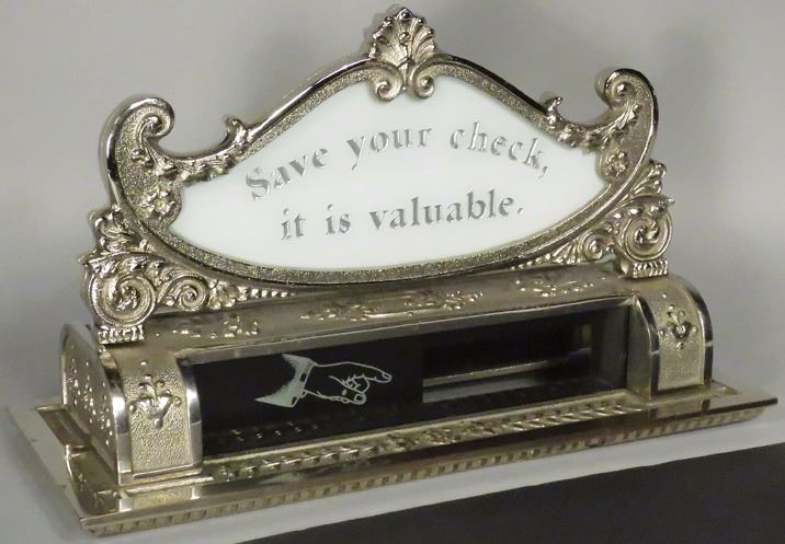 Cash Register Top Sign on Register Head. Etched glass, "Save your check, it is valuable" in topper. 13 X 5 3/4 inches.