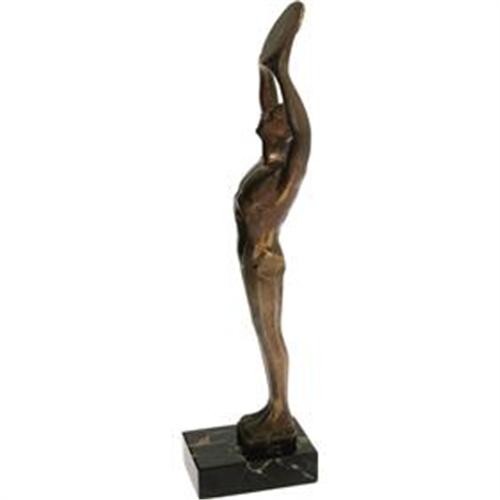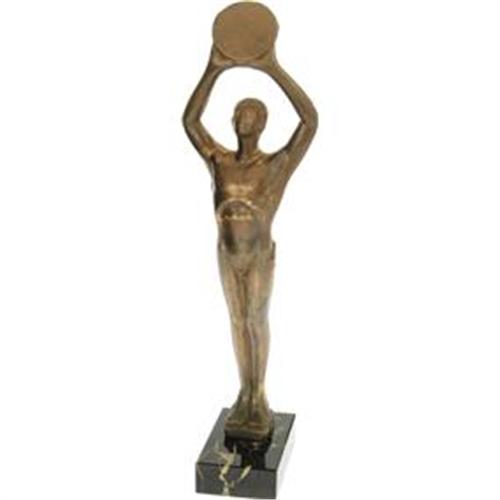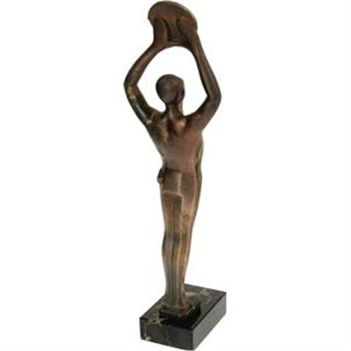 <B>Cash Box Award Prototype Statuette.</B></I> An early design prototype featuring the basic design for now-defunct <I>Cash Box</B></I> magazine's series of achievement awards. Founded in 1942 as a weekly publication devoted to the music and coin-operated machine industry, <I>Cash Box</B></I> folded in 1996 in the wake of a scandal involving allegations of chart fixing and murder. A great piece of Pop music history, the brass statuette stands 12" tall on a 2" x 1" x 3" marble base, and is in Very Fine to Excellent condition with some mild scratches and untrimmed flash around the edges.