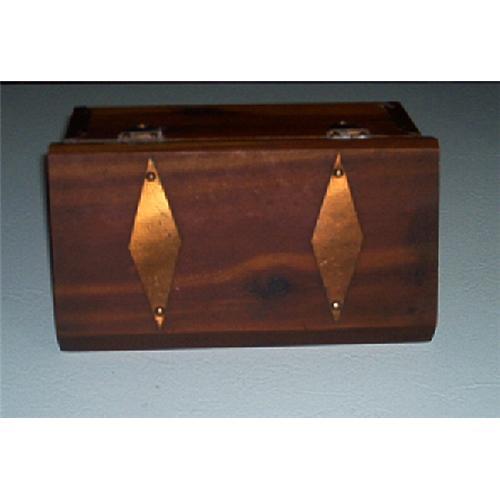 Decorative, Copper and Cedar Chest Casket. c. Late 1920's. Bottom of this Casket-Treasure Chest states: TRADEMARK - "STURDI" (REG. U.S. PAT. OFF.) CEDAR CHEST-FRANCIS F. HAMILTON CO., INDIANAPOLIS - PATENTED: Aug. 26, 1924 - Oct. 24, 1924 - March 18, 1925 - March 9, 1926 - NO. 210. This Cedar-Copper Decorative Chest was a miniture Casket that was given to the immediate family after the loss of a loved one. It also is a miniature of the original Casket that their loved ones were buried in. It is decorated with very thin copper diamond designs along with the edges having copper attached. Measurements are: 8 3/4 inches long by 4 7/8 inches wide. The lid measures: 9 3/8 inches long by 5 1/4 inches wide. Depth measures 3 inches. This miniature Casket belonged to one of my Great Uncles who owned a Merchatile Store with attached Funeral Home in the late 1800's and was closed in the early 1900's. Approximately 1951. Excellent Condition.