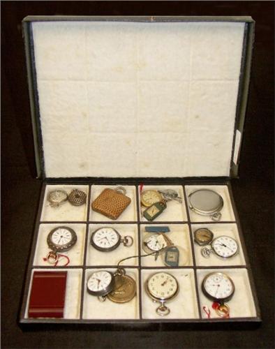 Etui comprenant: 2 montres de sac - 5 montres pendentifs - 3 boîtes en argent - 1 mouvement - 1 montre de poche en acier