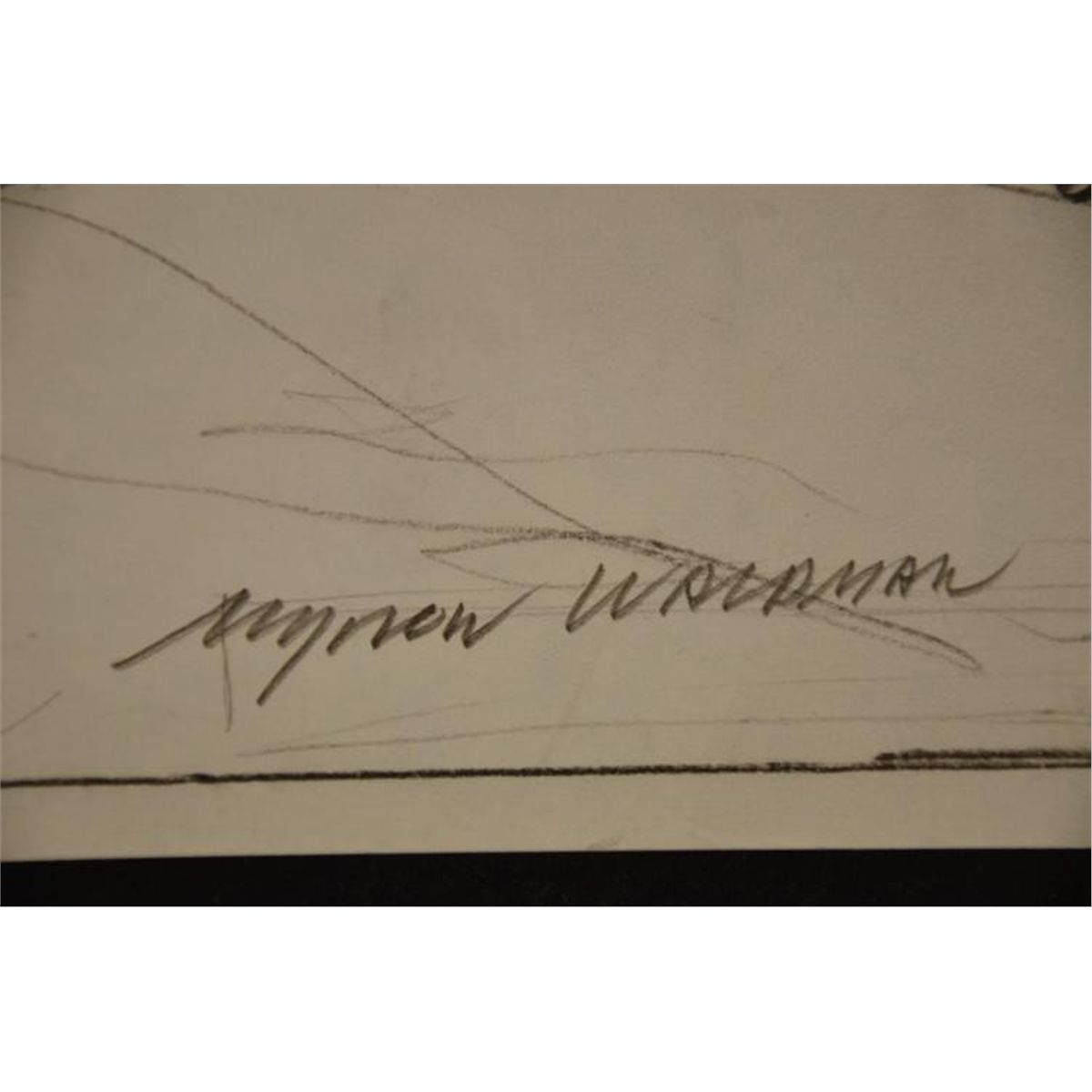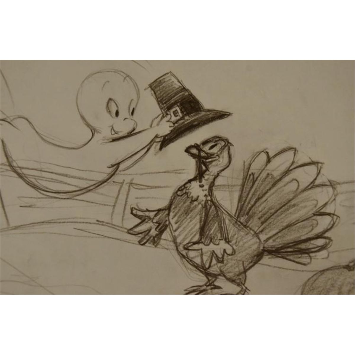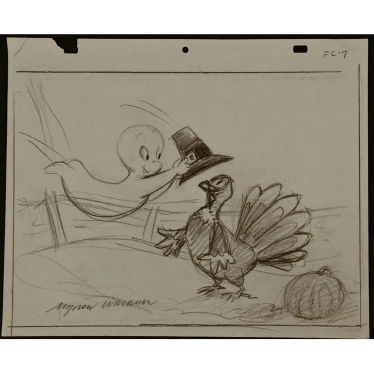 Casper the friendly ghost is even friendly to the Thanksgiving turkey, in this fun original production drawing. He's putting a pilgrim hat on the bird. The drawing is signed by its animator, Myron Waldman. The late Mr. Waldman was a head of Max Fleischer Studios in the early days when Popeye made his first appearance, and he's known as a pioneer in animation. * Animator: Myron WaldmanSigned: In pencil, lower left Medium: Black pencil on animator's paperSheet size: 10 1/4 x 12 1/4 inchesDetails: Numbers at the upper rightCondition: Very good condition, with crease marks and small tear at the upper left