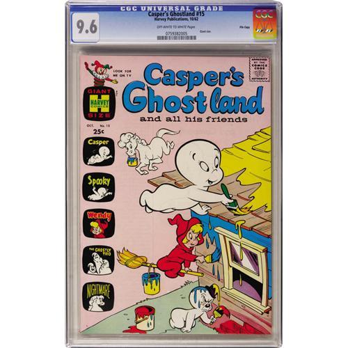 <B>Casper's Ghostland #15 File Copy (Harvey, 1962) CGC NM+ 9.6 Off-white to white pages. </B></I> Appearances by Spooky, Wendy, The Ghostly Trio, and Nightmare. 68 pages of spooky fun. Overstreet 2006 NM- 9.2 value = $80. CGC census 3/07: 1 in 9.6, none higher. <I> From the Cary and Cheryl Porter Collection.</B></I><BR><BR><b>Shipping:</b> Comics - Slabbed (certified) (<a target="_blank" href="http://www.heritageauctions.com/common/shipping.php">view shipping information</a>)