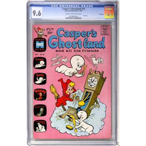<B>Casper's Ghostland #23 File Copy (Harvey, 1960) CGC NM+ 9.6 Cream to off-white pages.</B></I> Giant size. Overstreet 2007 NM- 9.2 value = $55. CGC census 6/07: 1 in 9.6, none higher. <I>From the Cary and Cheryl Porter Collection.</B></I><BR><BR><b>Shipping:</b> Comics - Slabbed (certified) (<a target="_blank" href="http://www.heritageauctions.com/common/shipping.php">view shipping information</a>)
