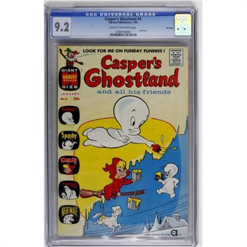 <B>Casper's Ghostland #4 File Copy (Harvey, 1960) CGC NM- 9.2 Cream to off-white pages.</B></I> Giant size issue. Overstreet 2007 NM- 9.2 value = $105. CGC census 3/08: 2 in 9.2, none higher.<BR><BR><b>Shipping:</b> Comics - Slabbed (certified) (<a target="_blank" href="http://www.heritageauctions.com/common/shipping.php">view shipping information</a>)