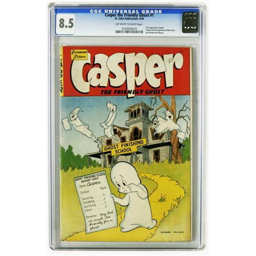 <B>Casper the Friendly Ghost #1 (St. John, 1949) CGC VF+ 8.5 Off-white to white pages.</B></I> It's the best copy yet certified of the first comic book appearance of Casper! Yes, ghost fans, the character started out in this St. John book before many decades at Harvey. What's more, this was the first time the character was called Casper in any medium (he was a nameless "Friendly Ghost" in his early cartoon appearances). And if even that's not enough historical significance for you, this issue has Baby Huey's first appearance and origin as well. Wait, we're not even done yet: there's also the first appearance of Herman the Mouse (of later Herman and Katnip fame). Overstreet 2005 VF 8.0 value = $1,200; VF/NM 9.0 value = $1,850. CGC census 11/05: 1 in 8.5, none higher.
