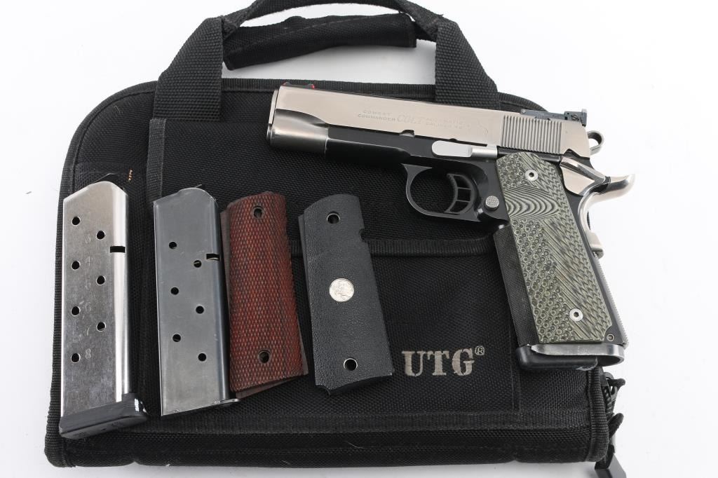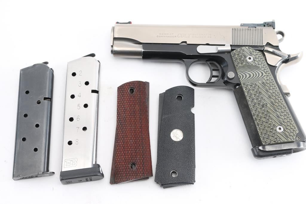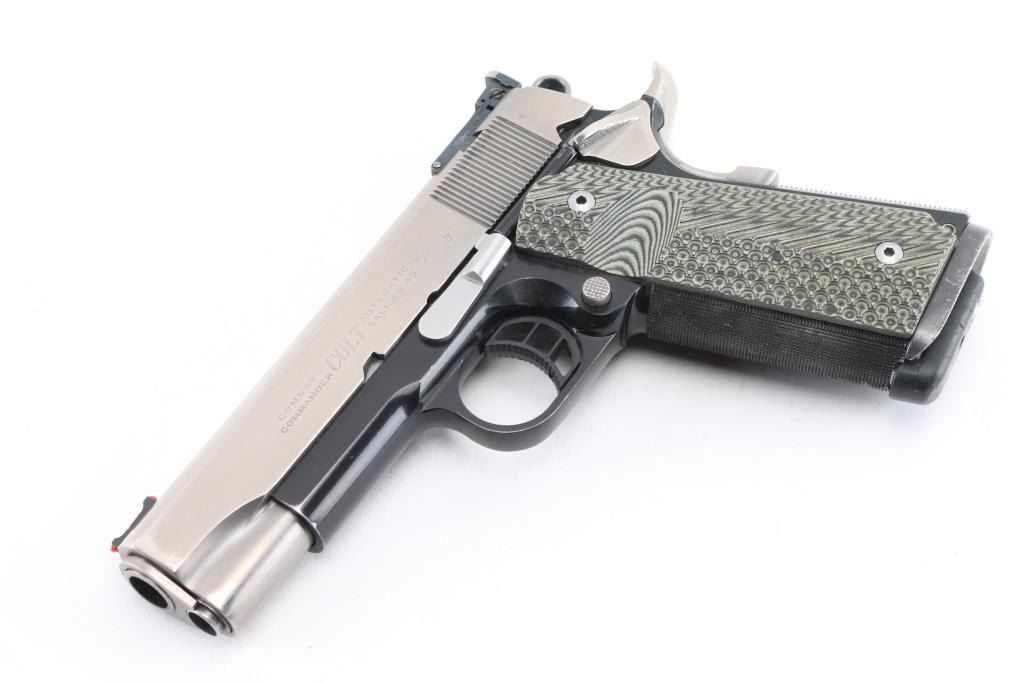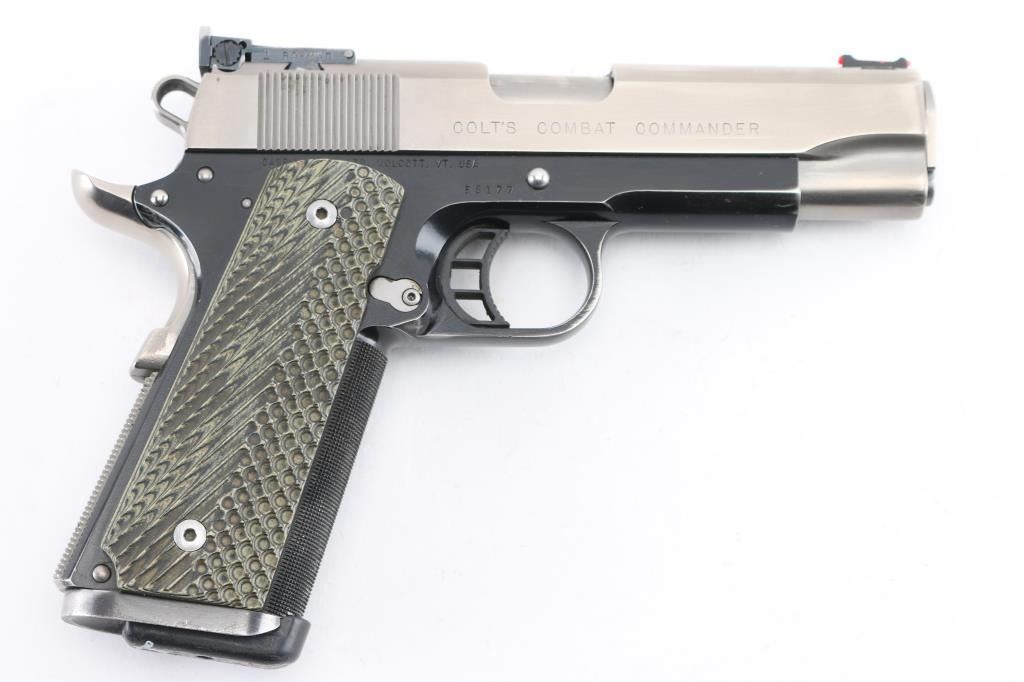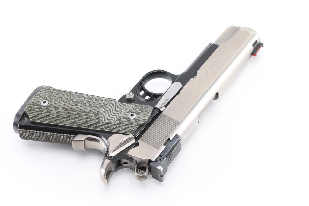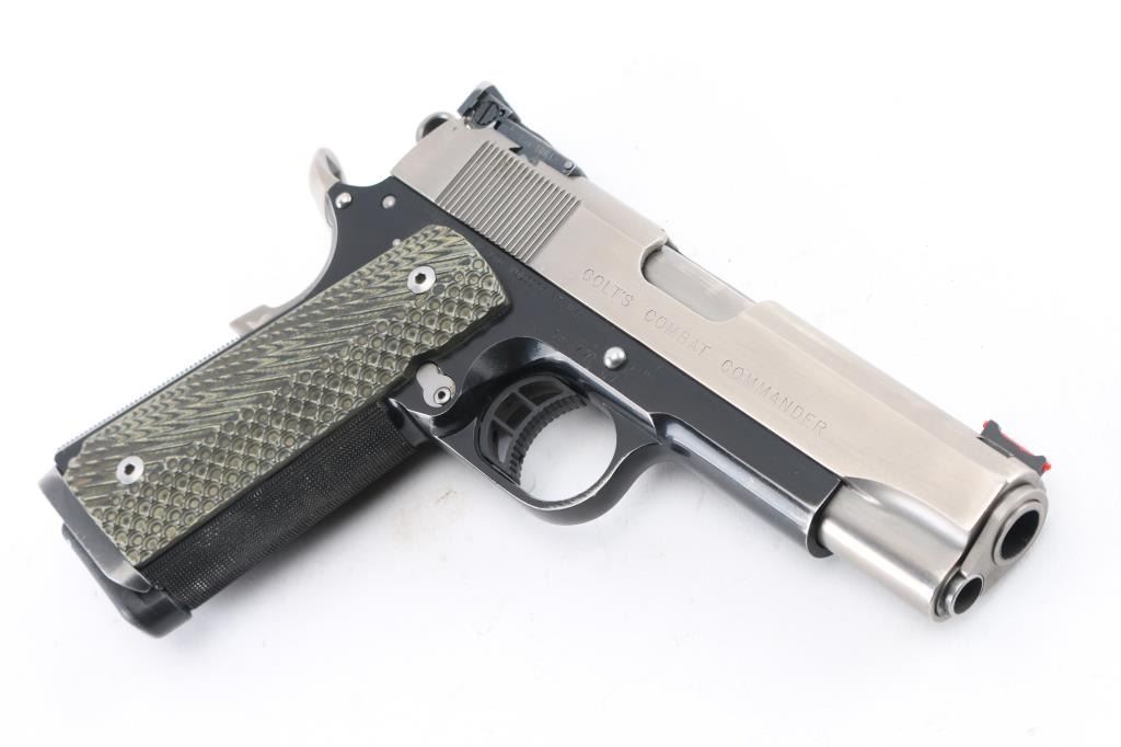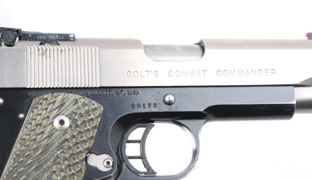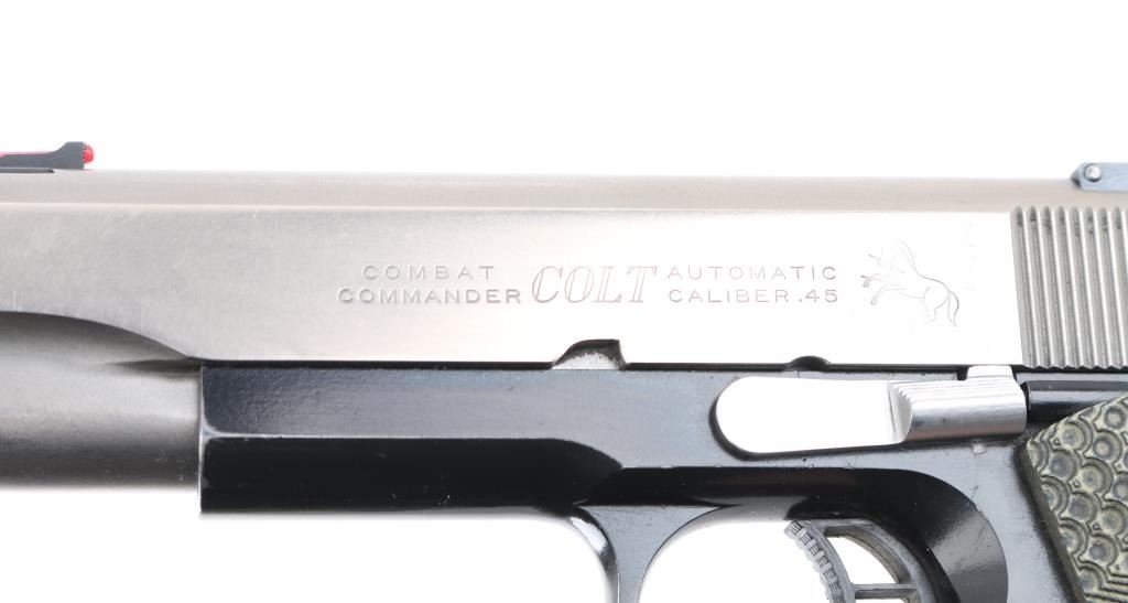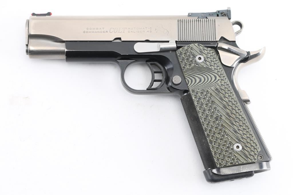 Custom semiautomatic pistol built on a Caspian frame, using Colt slide and other parts, chambered for 45 Auto. Frame is blued, slide is bare metal, controls are stainless. Features 4.25" Colt marked barrel, full length recoil spring guide, manual thumb safety, upswept beavertail grip safety with "memory groove" bump, flat checkered mainspring housing, checkered front strap, skeletonized trigger & hammer, fiber optic insert front sight in dovetail, Bo-Mar adjustable rear sight, flared magazine well funnel, green & black laminated G10 grips. Bore is excellent condition. Frame shows losses from use, retains 85% finish. Bare metal parts are very good condition. Includes three magazines (one each Kimber, Ed Brown, McCormick), extra grip sets (one set is checkered wood, other is black polymer with Colt medallions). Condition is NRA Very Good++ as customized *** Modern Firearm ***