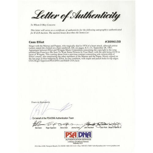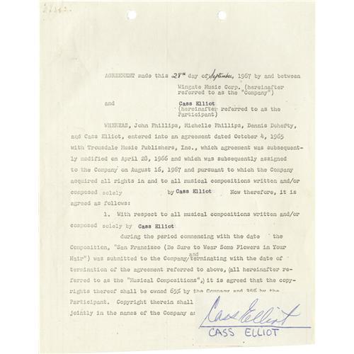 <B>Cass Elliot Signed Contract.</B></I> A six-page contract between Elliot and Wingate Music Corporation, dated September 28, 1974, concerning the copyright to the song "San Francisco (Be Sure to Wear Some Flowers in Your Hair)". Nicely signed by Elliot in blue ballpoint on the last page. In Very Fine to Excellent condition with the usual binder and staple holes to the top edge. <I>Accompanied by certificates of authenticity.</B></I><I>Accompanied by LOA from PSA/DNA.</B></I><BR><BR><b>Shipping:</b> Flat Material, Small (<a target="_blank" href="http://www.heritageauctions.com/common/shipping.php">view shipping information</a>)