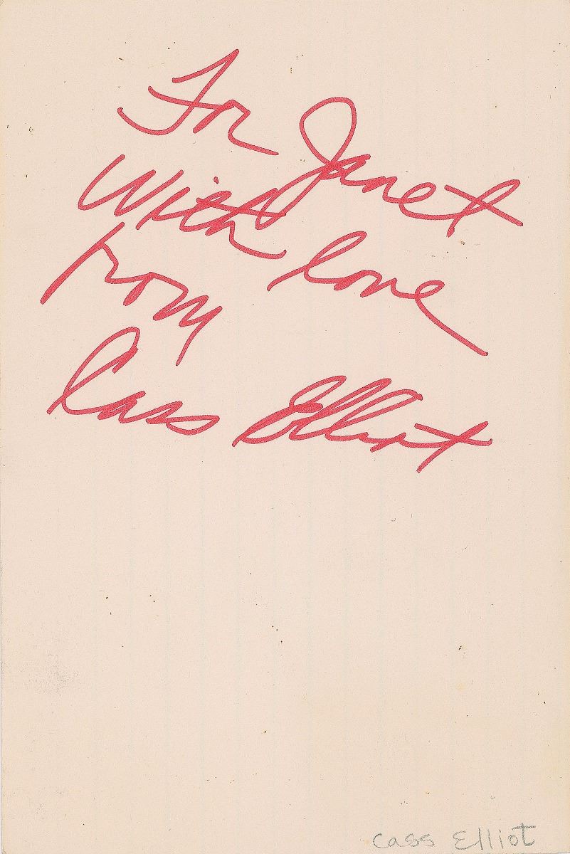 Felt tip signature and inscription, “For Janet, with love from, Cass Elliot,” on an off-white 4 x 6 card. In fine condition.