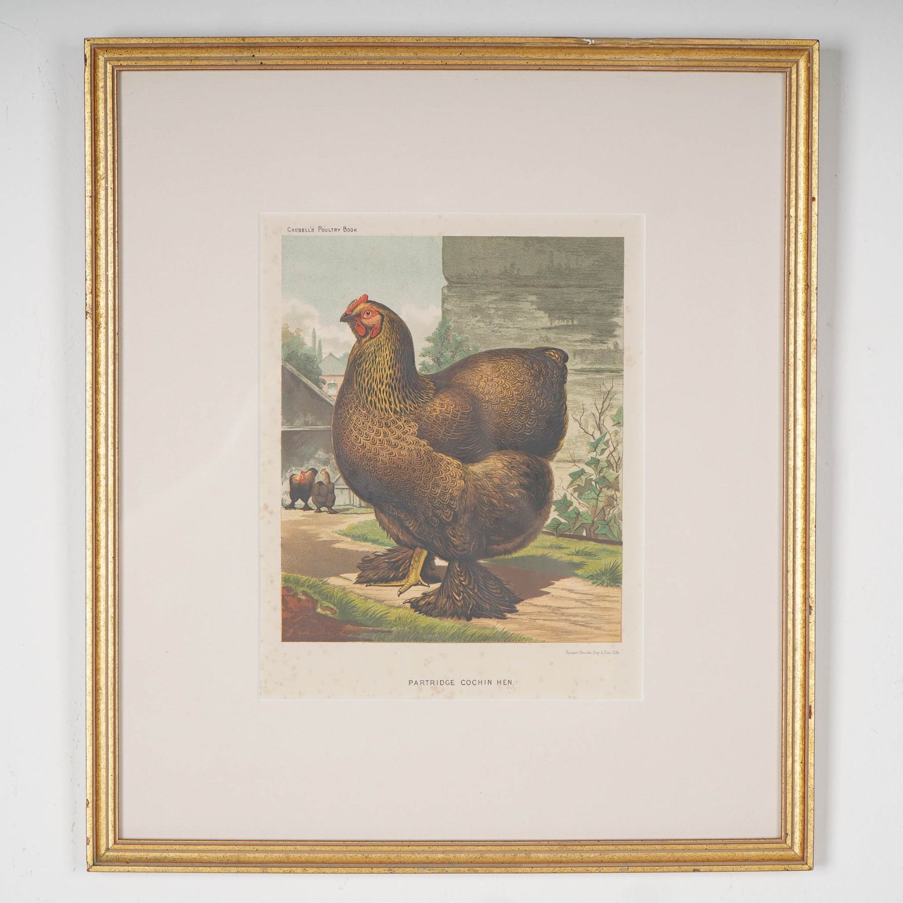 A vivid 19th-century chromolithograph titled Partridge Cochin Hen, published as part of Cassell's Poultry Book. This antique print showcases a finely feathered hen standing in profile within a pastoral farmyard setting. Rendered by Vincent Brooks Day & Son Lith., the scene is richly colored with exquisite attention to texture and feathering, characteristic of Victorian natural history illustrations. The plate is professionally framed in a gilt frame and matted.