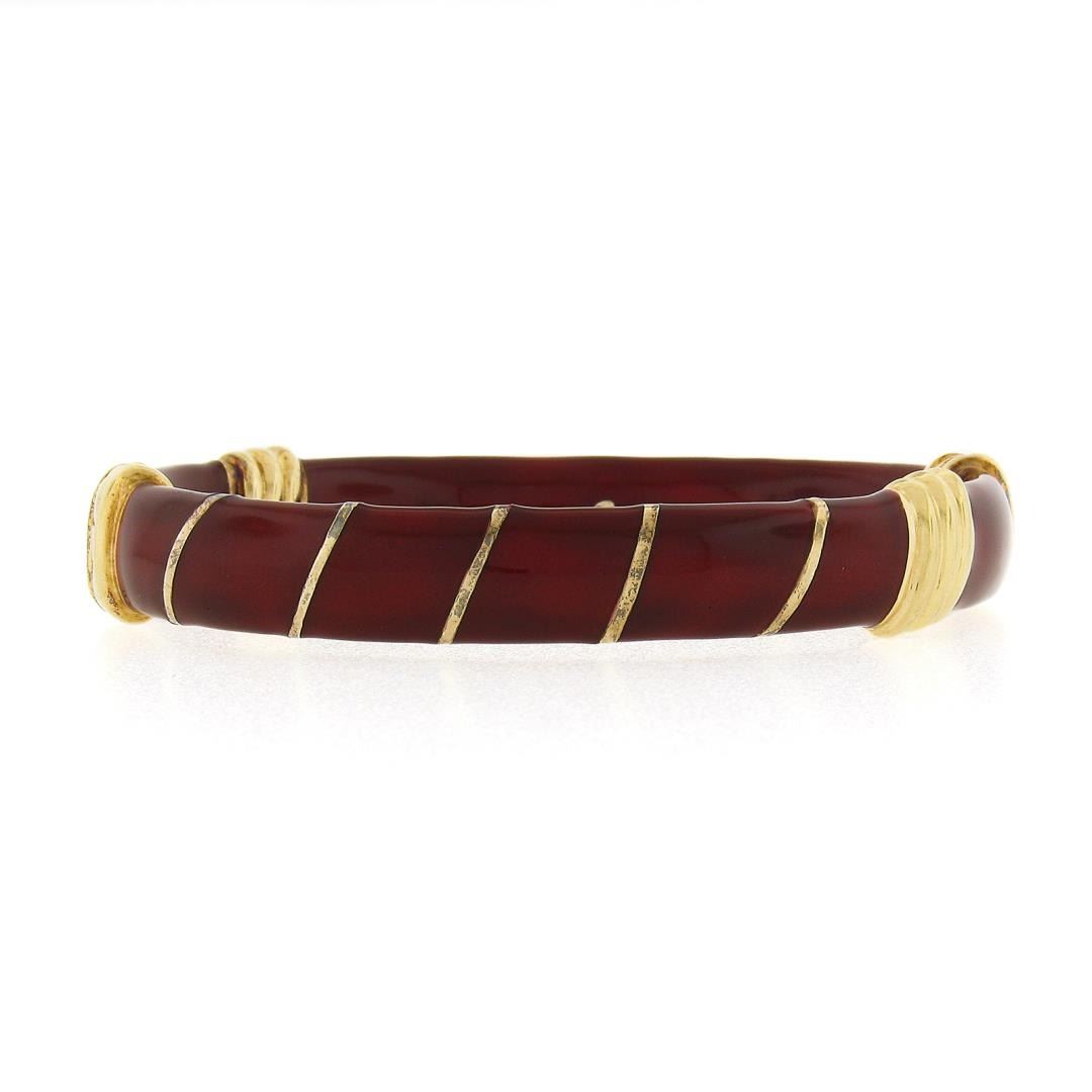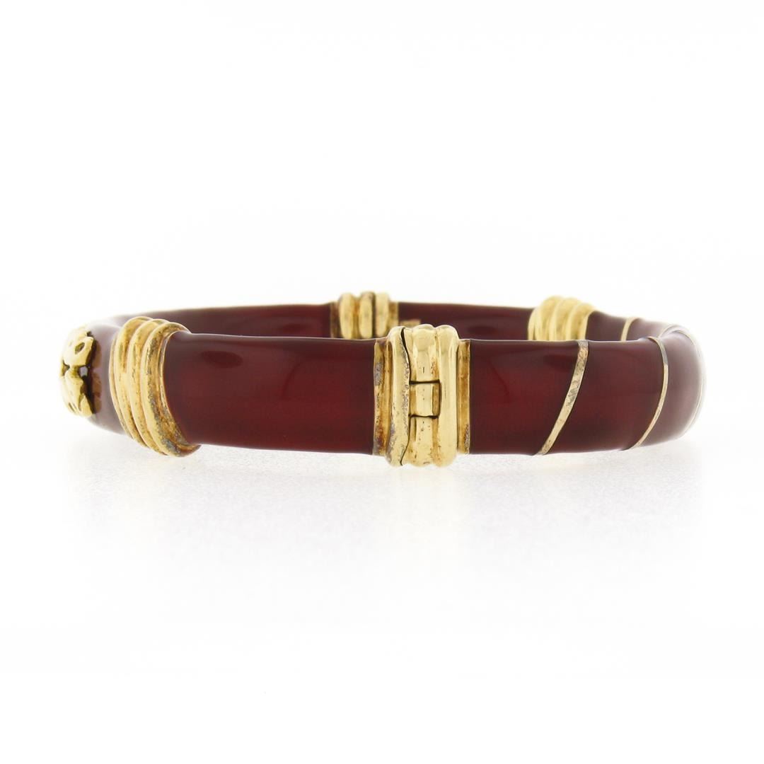 A solid 18k yellow gold elephants bangle bracelet by Cassetti, with red enamel work. It weighs a total of 35.16 grams, measures 12.40mm wide, and measures 6.75 inches in length.