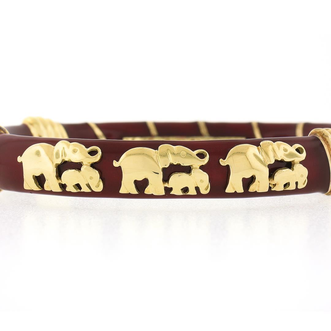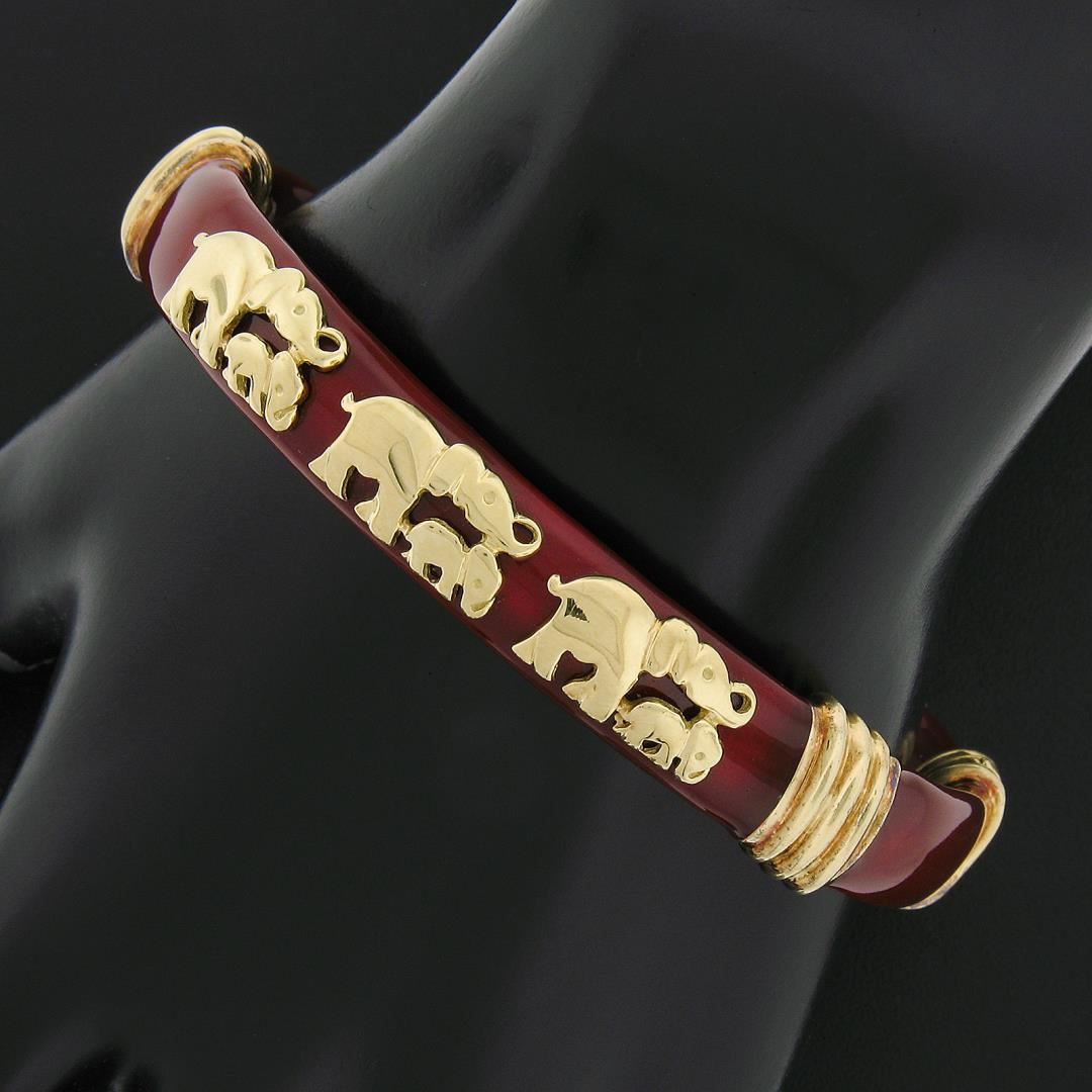 A solid 18k yellow gold elephants bangle bracelet by Cassetti, with red enamel work. It weighs a total of 35.16 grams, measures 12.40mm wide, and measures 6.75 inches in length.