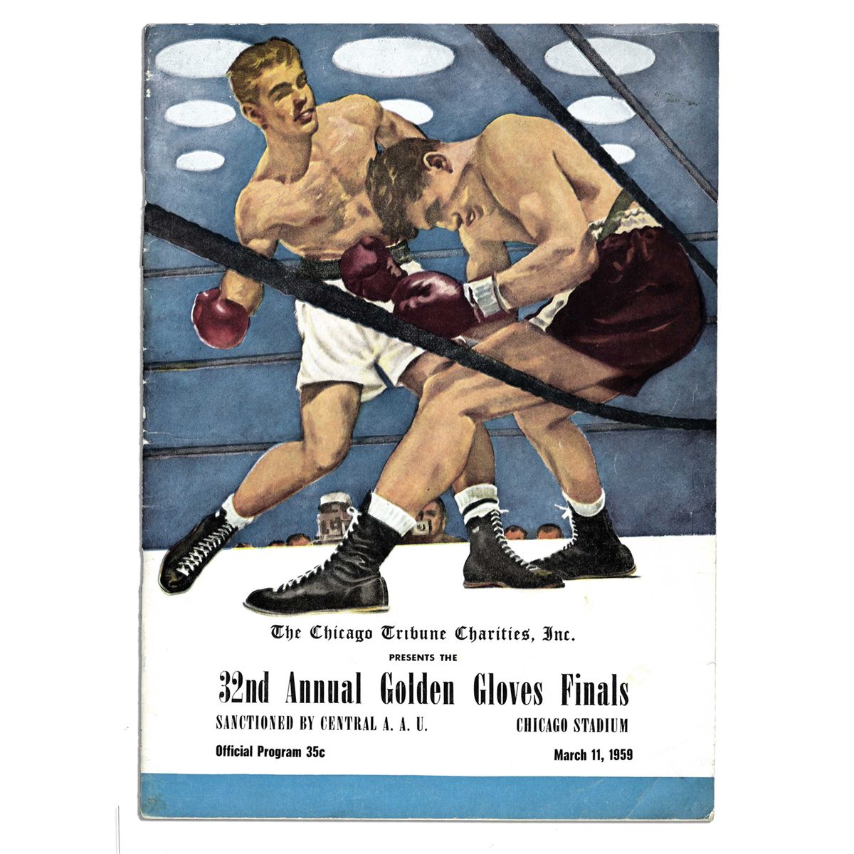 Original program for the 32nd Annual Golden Gloves Finals, held at Chicago Stadium on 11 March 1959, in which a 17-year-old Cassius Clay won the 175 pound division. Program features Clay on page 41. Program is in remarkably nice condition, with all pages intact, interior pages unmarked and no tears. There is light soiling and creasing to the covers with the lower corners showing a dog-eared bend. Interior pages are lightly creased, but else in near fine condition. Overall, a remarkably well-preserved copy in very good condition.