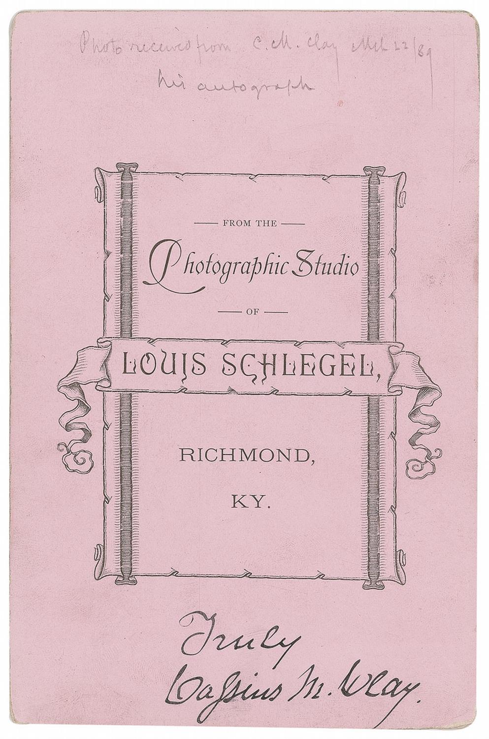 Prominent abolitionist leader (1810–1903) known as the “Lion of Whitehall.” An ardent supporter of Lincoln, he served as American Minister to Russia from 1862 to 1869, in which capacity he was instrumental in negotiations for the purchase of Alaska. Original 4.25 x 6.5 cabinet photo by Louis Schlegel of Richmond, Kentucky, signed on the reverse in black ink, “Truly, Cassius M. Clay.” In fine condition, with pencil notations to top of reverse, as well as a bit of light soiling. Provenance: The Barry Hoffman Collection.
