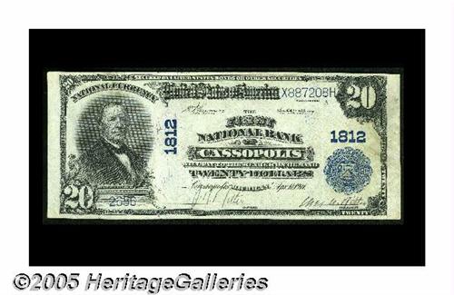 <B>Cassopolis, MI</B></I> - $20 1902 Plain Back Fr. 653 <B>The First NB</B></I> Ch. # 1812<BR>A well-centered <B>Extremely Fine</B></I> with delicate black officers' ink signatures and well-balanced margins all around. A large size note from a bank far more well known as the source of a small hoard of uncut sheets of the 1929 issue.
