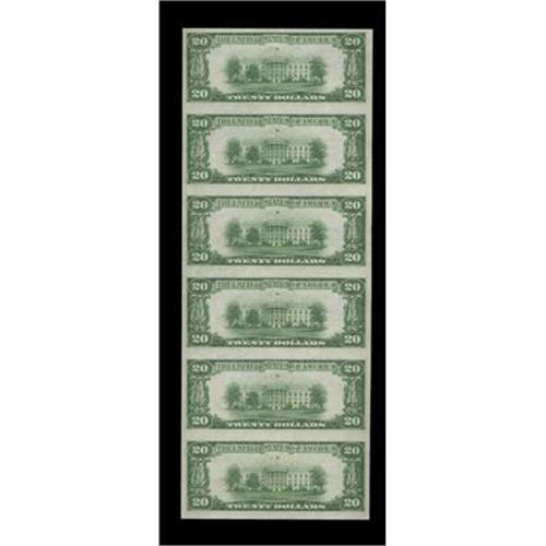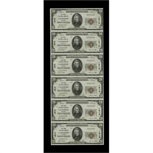 <B>Cassopolis, MI</B></I> - $20 1929 Ty. 1 <B>The First NB</B></I> Ch. # 1812 Uncut Sheet<BR>Bright and embossed is this 69th sheet for this denomination and type on this bank. There are far fewer $20 uncut sheets on this bank than $5 uncut sheets. <B>Very Choice Crisp Uncirculated.</B></I><BR><I>From The Plymouth Rock Collection</B></I>