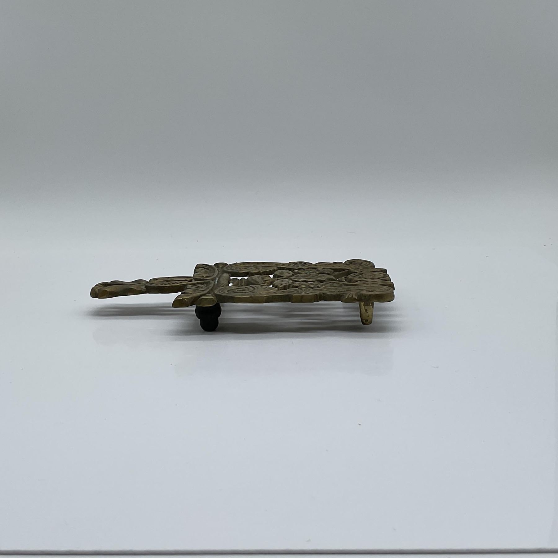 A vintage cast brass trivet featuring an intricate grapevine and scrollwork motif. This decorative piece showcases finely detailed craftsmanship with raised floral and leaf elements, adding an elegant touch. The trivet is designed with four small feet, likely with protective coverings, for stability and surface protection. Crafted from solid brass, this trivet exhibits a rich patina, indicative of its age. The ornate design suggests a Victorian or early 20th-century style, making it a functional yet decorative addition to any collection. Ideal for use in kitchens, dining settings, or as a wall display.