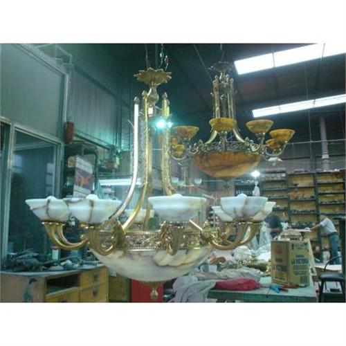 Ten tulips, twelve lights, alabaster stone and casted bronze grand chandelier.It will be shipped in two crates, one with the alabaster component the other one with the bronze component. Some assembly will be required. The shipping cost within USA is $ 175.00. This iten is in working condition and was rewired to USA standards. It will take 4 to 5 weeks to deliver.