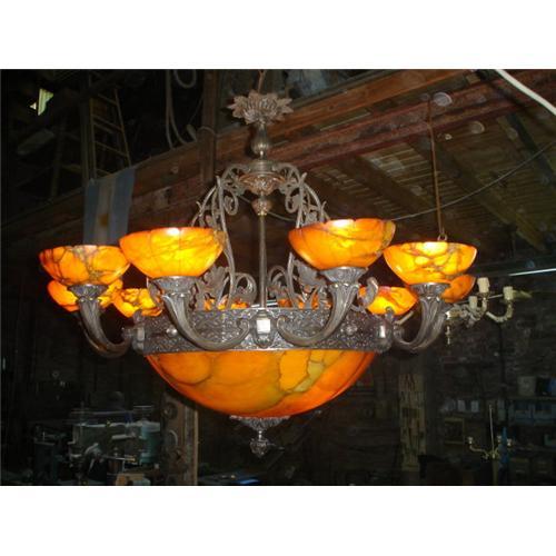 Ten tulips, twelve lights, alabaster stone and casted bronze grand chandelier.It will be shipped in two crates, one with the alabaster component the other one with the bronze component. Some assembly will be required. The shipping cost within USA is $ 175.00. This iten is in working condition and was rewired to USA standards. It will take 4 to 5 weeks to deliver.