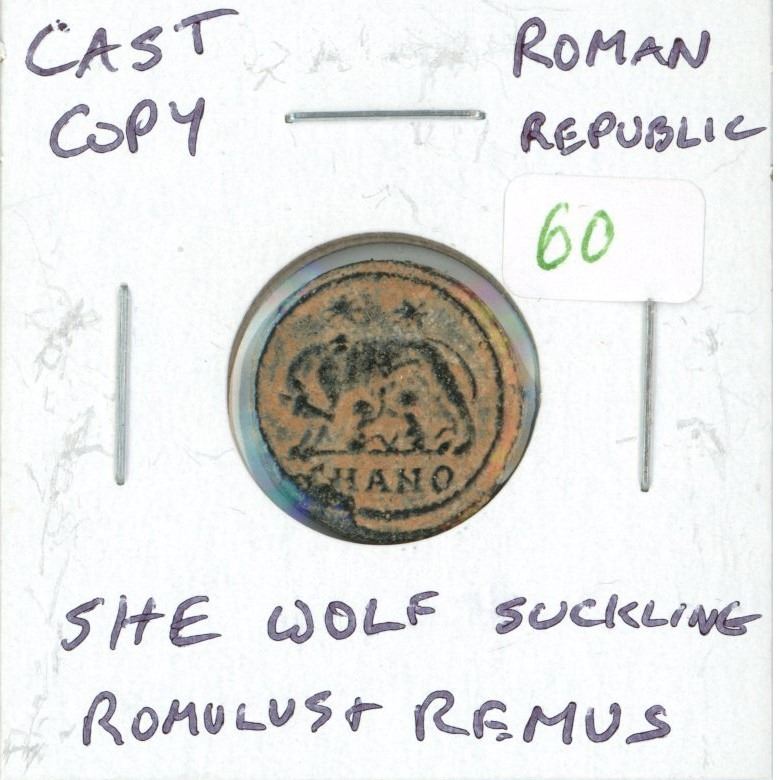 Cast Copy of an Ancient Roman Republic Denarius. She-wolf suckling Romulus & Remus. VF.