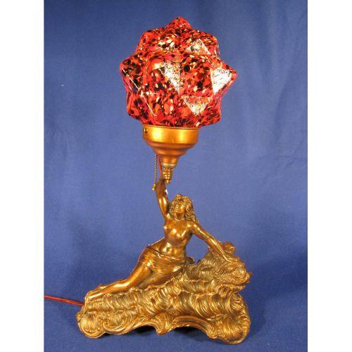 Cast metal Art Deco figural lamp, 16", spatter ware shade, rare