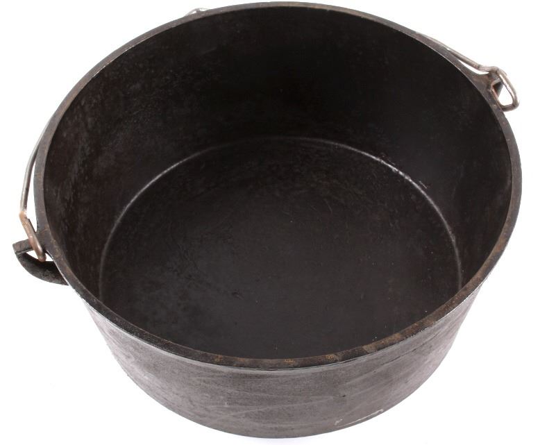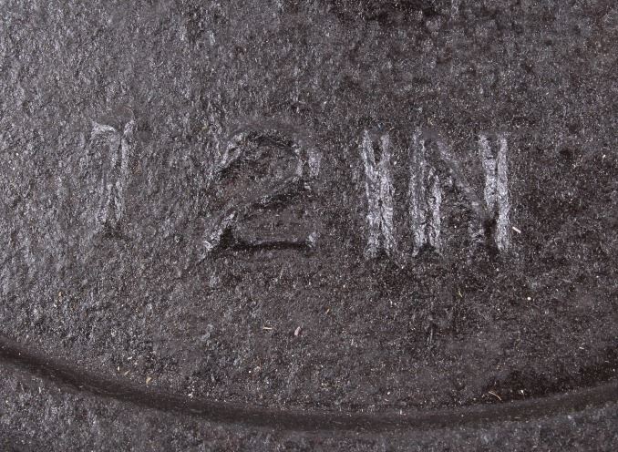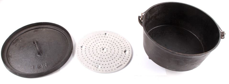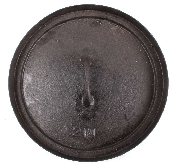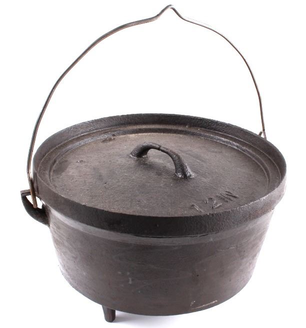 This lot features a cast iron footed Dutch oven. The Dutch oven features a bail handle and is complete with the lid and new trivet. It is marked "12 IN & 12DC". The Dutch oven is in good condition, it has been cleaned and seasoned. It measures 7 1/2" H x 13 1/2" in diameter.