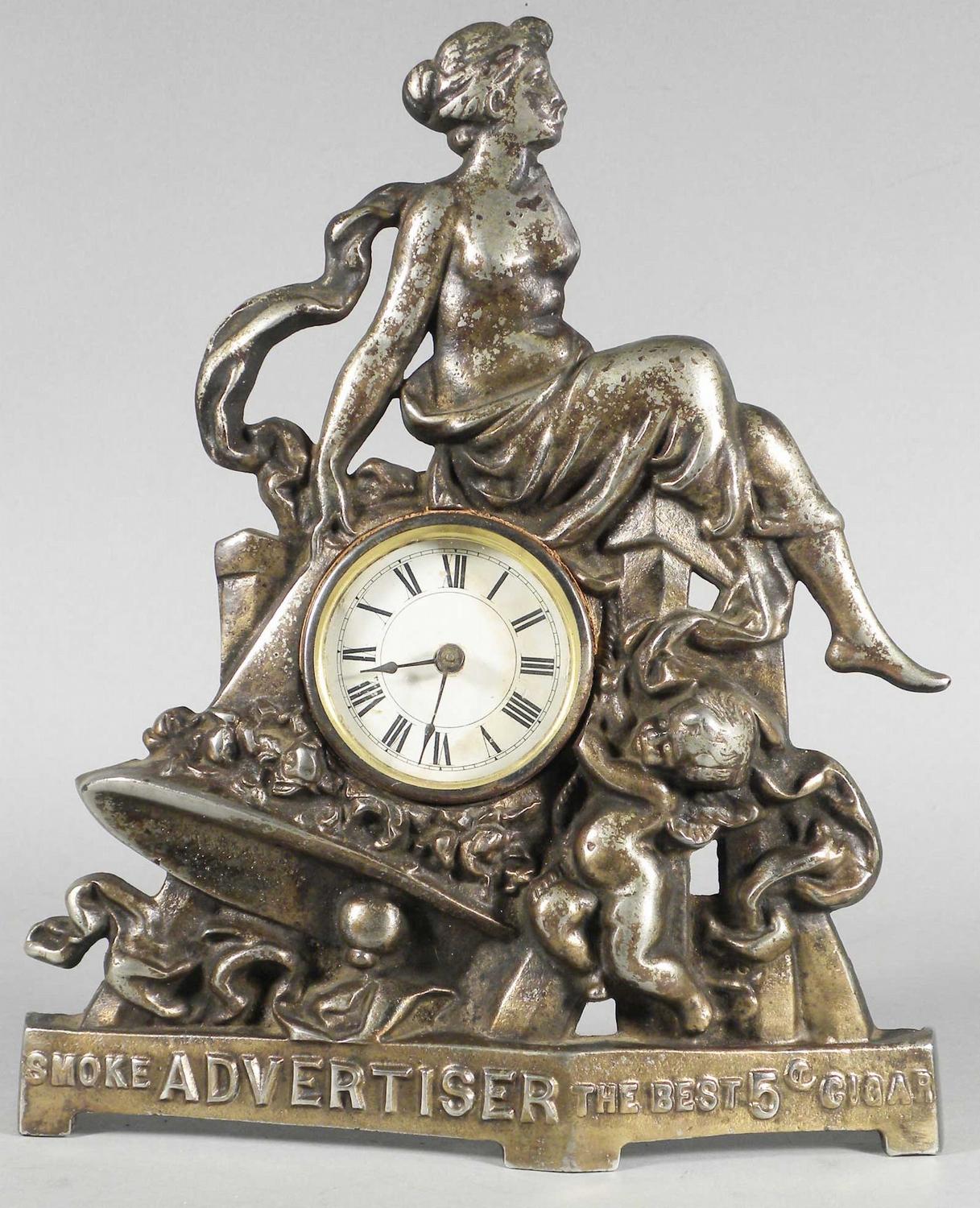 Cast Iron Advertising Clock for Advertiser Cigars. "The best 5 cent cigar". Patent Sept 22, 1885. Some surface wear to the casting otherwise good condition. 10 X 11 1/2 X 2 1/4 inches.