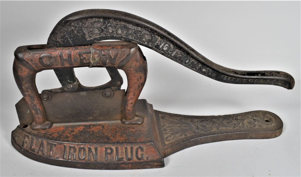 Cast Iron Advertising Tobacco Plug Cutter for Flat Iron Plug. Scotten Dillon Co. Crack in top casting. 17 X 8 X 5 1/4 inches.