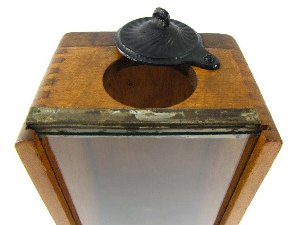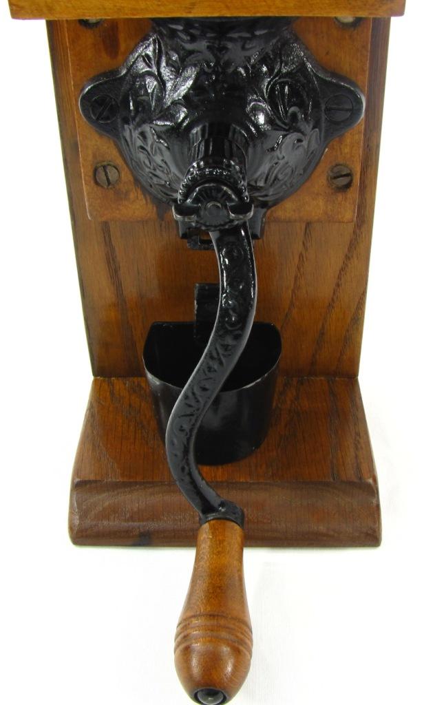 17" x 5-1/2" x 8-1/4". This is an original Arcade grinder and box, circa 1890-1920. It holds approximately a pound of coffee beans. The handle has an adjustment so you can customize the grind. This is great for the collector or as a working decorative item. The grinder is mounted on a removable oak stand so you can stand it on a counter, or if you removed it you could mount it on your wall.