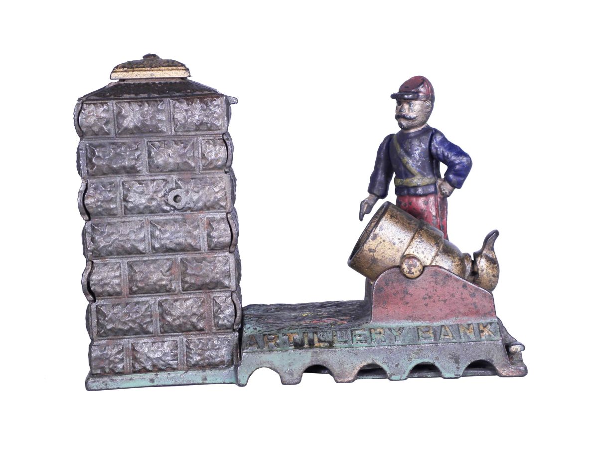 Cast Iron Artillery Union Soldier Mechanical Bank. Very good original condition with 80% of original paint intact. 8 inches long.