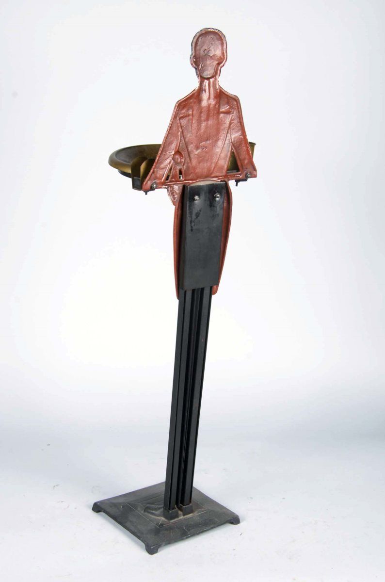 Painted figural stand with brass ashtray, match/cigarette holder and matchbox holder. Condition (Very good). Size 7" x 7" x 33"