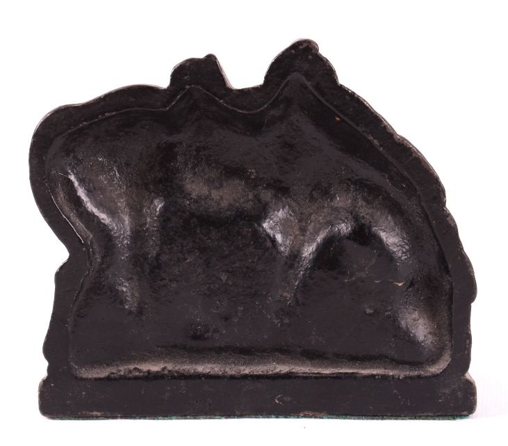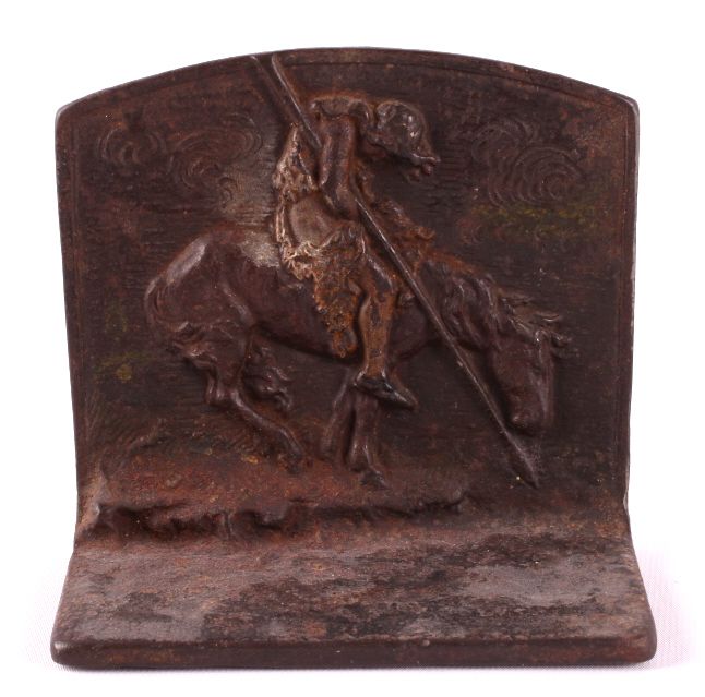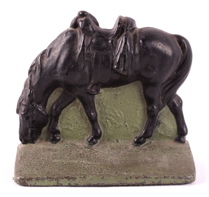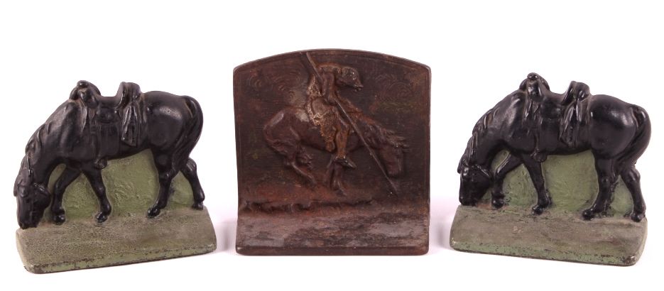 This lot includes 3 cast iron bookends. There is a set of matching horse bookends along with a single bookend. The single bookend is a depiction of Frederic Remington's "End of the Trail". The horse bookends are painted and have a unique look. All the bookends are in very good condition. The "End of the Trail" measures 5.5" x 5" and the horses measure 5" x 4.5".