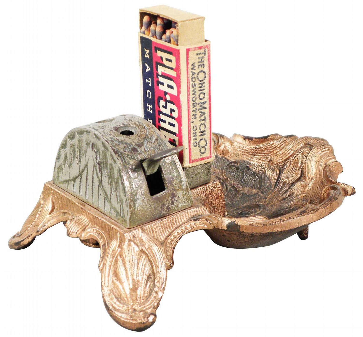 Cast Iron Cigar Cutter, Match Holder, Ashtray. Good original condition. 6 1/4 X 3 X 5 1/4 inches.