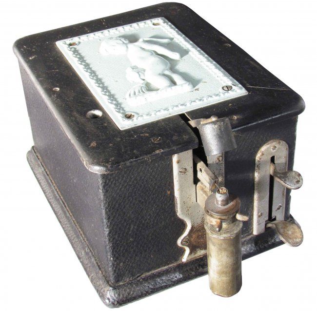 Cast Iron Cigar Lighter with Embossed Cherub Motif on Top. Good working condition. 7 1/2 X 5 1/2 X 11 inches.