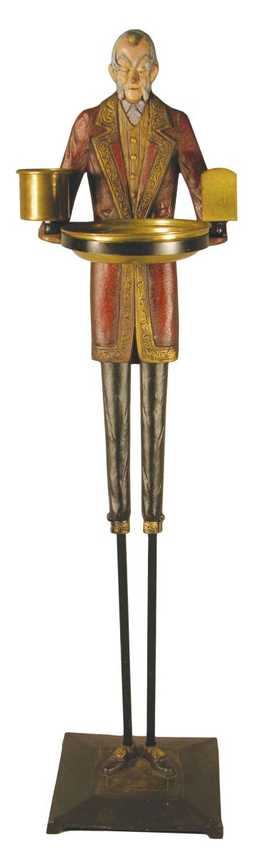 Cast Iron Cigarette Butler with brass cigarette pack and match holder and ashtray. Repaint. 37 inches tall.