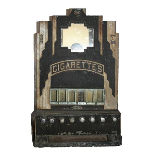 Cast Iron Cigarette Machine with Deco Styling. Unrestored condition. Measures 19" x 31" H..