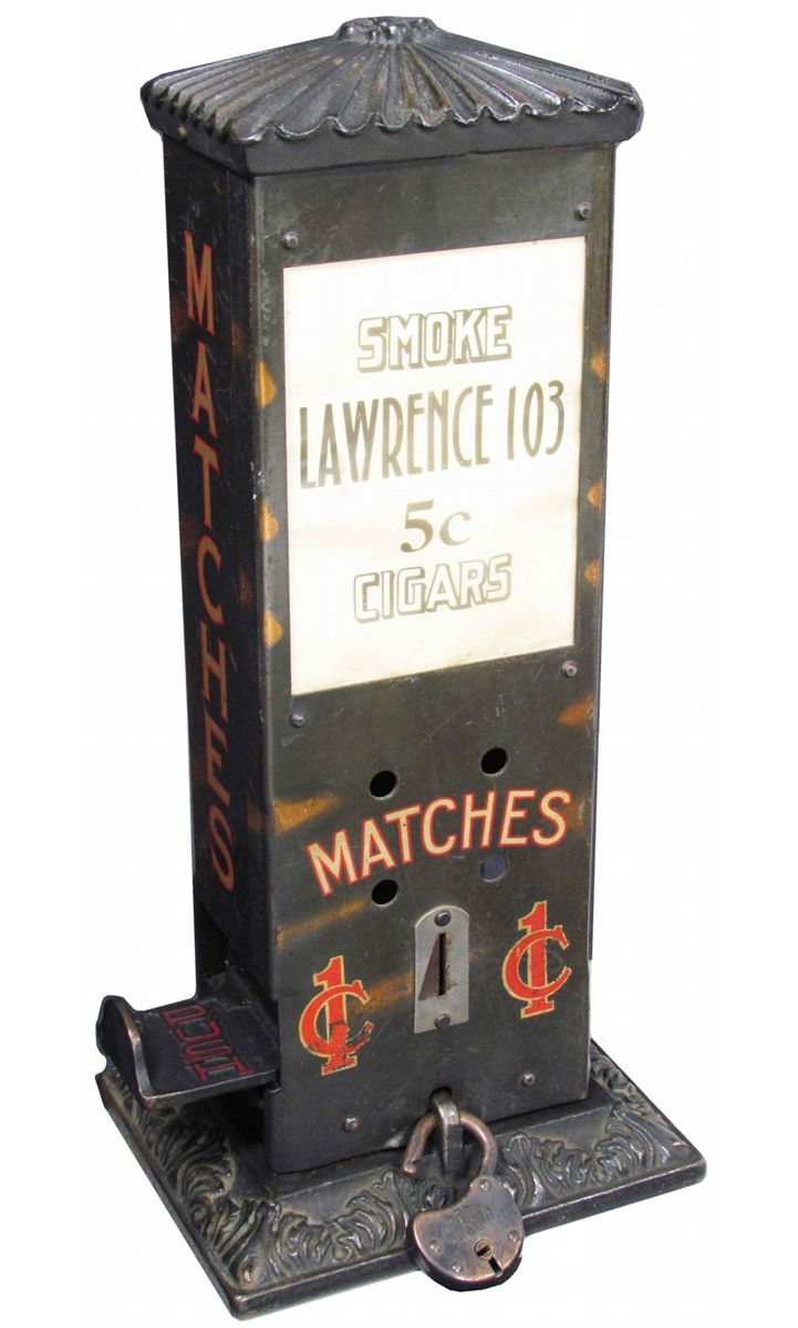 Cast Iron Coin Operated One Cent Match Dispenser. Copper flashed all original condition. 5 3/4 X 13 X 4 3/4 inches.